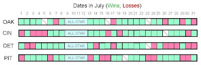 Finally, the Los Angeles Dodgers and San Francisco Giants, who are battling for first place in the National League West, each exhibited streakiness in July. Whenever one of these teams won a few games in a row, it would follow-up by losing a few straight.